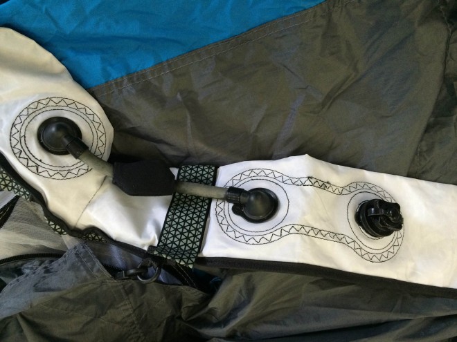 空気を入れるフレームは、テントとフックでつながっているのですが、