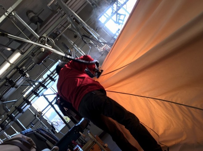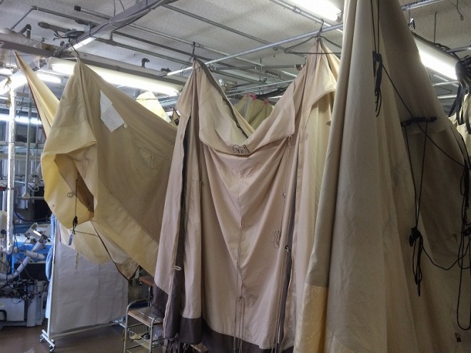 天井高4メートルある工場内で、めいいっぱい広げて干しておりますので、しっかりと乾きます。