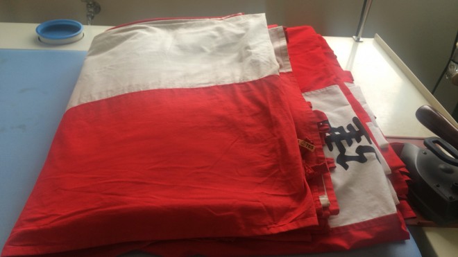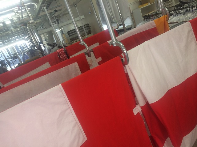 縁起物の紅白幕はピシっとおろしたてのような状態に近づけるようにアイロンがけしていきます。