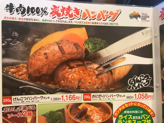 牛肉100%炭火焼きハンバーグ!250gの(¥1,080)に!!ランチにはライスかパンとスープが付いてきます。