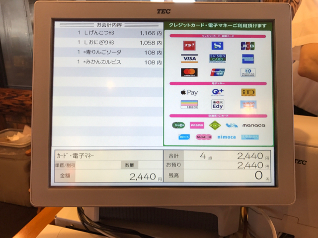 支払いもクレジットカードや、スイカ、nanacoなども幅広く対応していました。