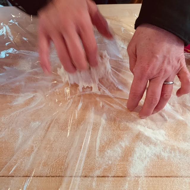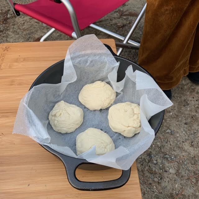 パンの生地をこねて、ダッチオーブンに入れます。