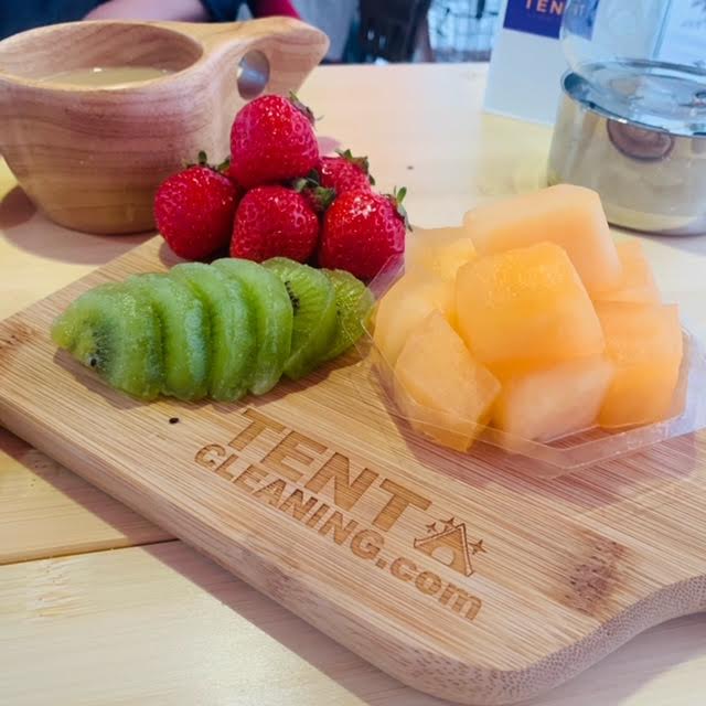 フルーツが乗っているのは、 テントクリーニングのカッティングボードです!